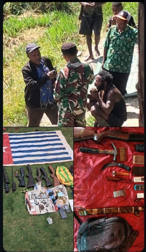 Dari lokasi kejadian, aparat juga mengamankan sejumlah barang bukti yang mengindikasikan aktivitas kelompok bersenjata, antara lain dua pucuk senjata rakitan, satu pucuk senapan angin, munisi kaliber 5,56 mm dan 7,62 mm, satu selongsong peluru, busur dan anak panah, serta berbagai senjata tajam seperti parang, kapak, pedang, dan pisau. Selain itu ditemukan pula perlengkapan komunikasi berupa beberapa unit telepon genggam dan handy talky (HT), bendera OPM, serta dokumen identitas dan perlengkapan pribadi lainnya.